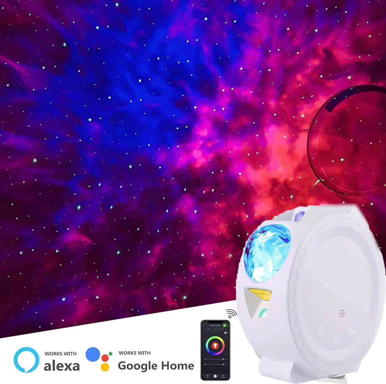 The smart app allows you to take full control of the Galaxy Projector. Unlimited color combinations, an RGB dial, ability to control the effect brightness, set timers and schedules and so much more.